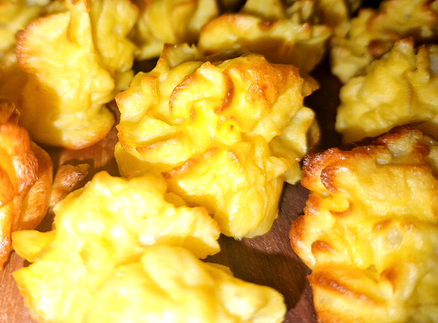 Using a piping bag, create walnut-sized shapes similar to piping frosting on a cupcake. Mix the 6th egg yolk with some salt to egg wash the potatoes mounds. Bake in the oven for 10 minutes.